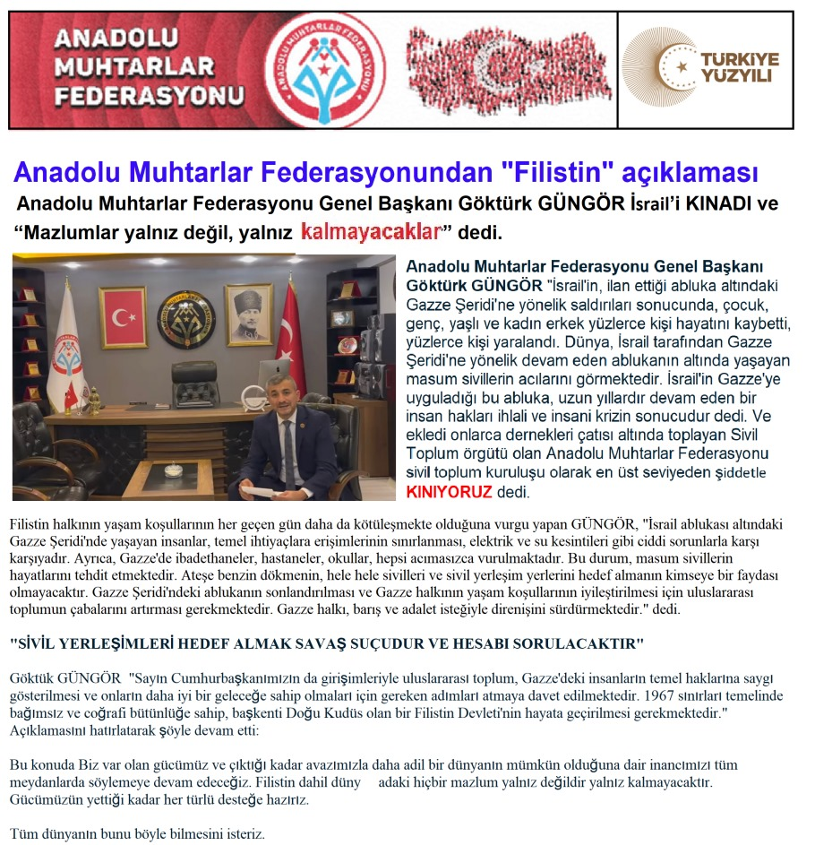 Anadolu Muhtarlar Federasyonu Genel Başkanı Göktürk GÜNGÖR "İsrail'in, ilan ettiği abluka altındaki Gazze Şeridi'ne yönelik saldırıları sonucunda, çocuk, genç, yaşlı ve kadın erkek yüzlerce kişi hayatını kaybetti, yüzlerce kişi yaralandı. Dünya, İsrail tarafından Gazze Şeridi'ne yönelik devam eden ablukanın altında yaşayan masum sivillerin acılarını görmektedir. İsrail'in Gazze'ye uyguladığı bu abluka, uzun yıllardır devam eden bir insan hakları ihlali ve insani krizin sonucudur dedi. Ve ekledi onlarca dernekleri çatısı altında toplayan Sivil Toplum örgütü olan Anadolu Muhtarlar Federasyonu sivil toplum kuruluşu olarak en üst seviyeden şiddetle KINIYORUZ dedi.